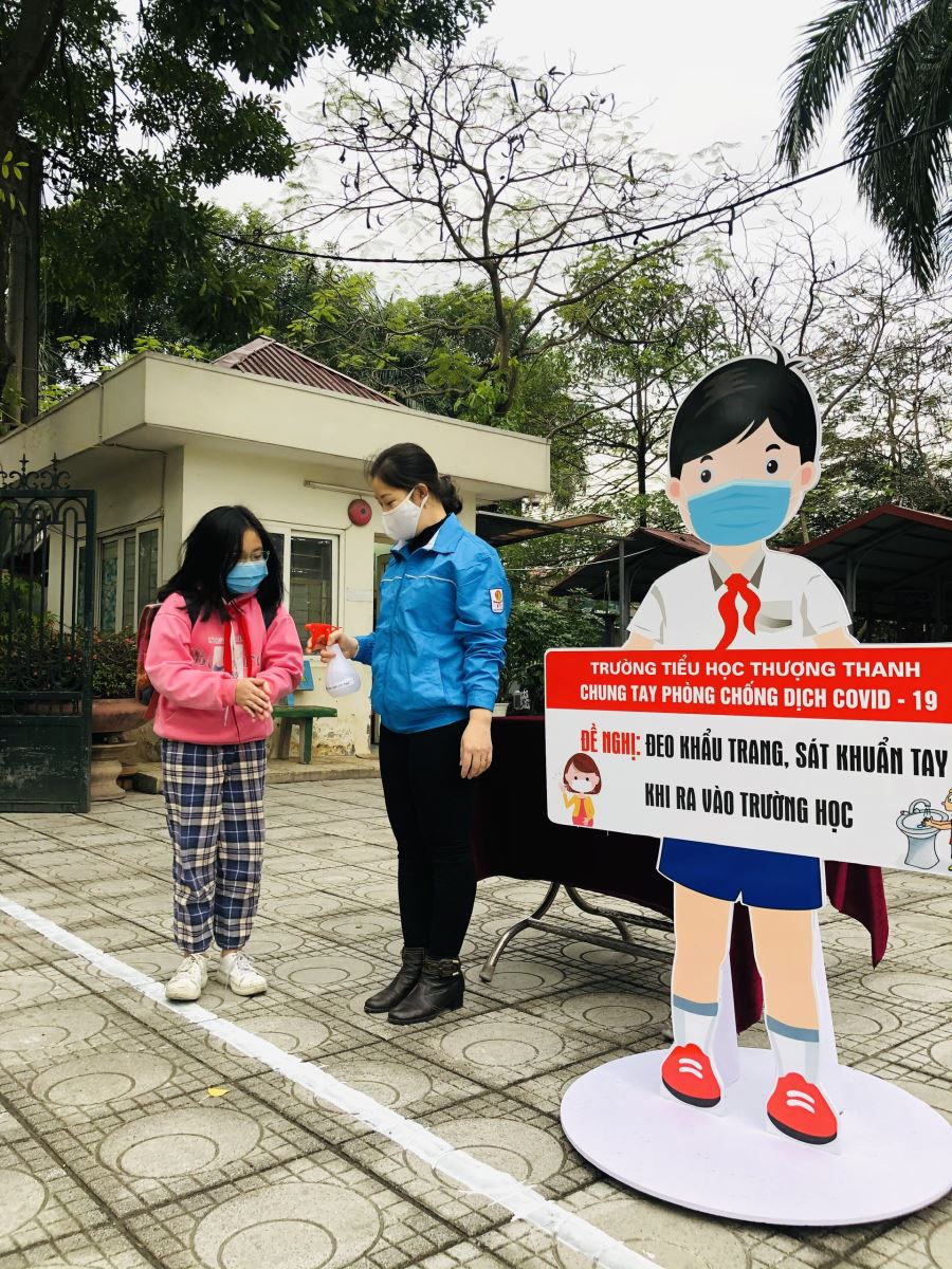 Cổng trường Tiểu học Thượng Thanh sáng nay thật rộn ràng. Từ sáng sớm, nhà trường đã sẵn sàng chào đón các con học sinh. Các bạn đến trường tươi vui đều không mang theo một chiếc khẩu trang xinh xắn trên mặt, các bạn bước vào trường theo lối đi chỉ dẫn nhằm đảm bảo khoảng cách và được rửa tay, xịt khuẩn theo đúng thông điệp 5K của Bộ Y tế, trước khi vào lớp, các bạn đều được cô giáo chào đón bằng cử chỉ ân cần và không quên một việc làm quan trọng là kiểm tra thân nhiệt.