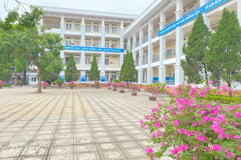 Khuôn viên, cảnh quan sư phạm của nhà trường được trồng nhiều cây xanh và những chậu hoa giấy tươi thắm, làm sáng bừng trường học xanh – sạch – đẹp.