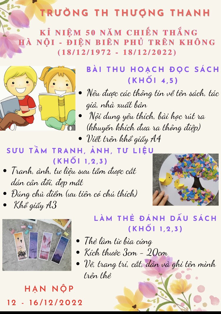 Bằng đôi bàn tay nhỏ bé, các con khối 1,2,3 đã thể hiện tình yêu, lòng biết ơn của mình qua những bức tranh, ảnh, tư liệu sưu tầm được và cắt dán, trang trí cân đối, đẹp mắt. Những bức tranh như đang tái hiện lại những sự kiện lịch sử tiêu biểu, những dấu mốc quan trọng trong chiến thắng lừng lẫy của dân tộc ta cuối năm 1972. Không chỉ vậy, các bạn nhỏ còn thể hiện sự khéo léo và sáng tạo bằng cách làm thẻ đánh dấu sách từ bìa cứng. Mỗi tấm thẻ được cắt dán, vẽ, trang trí rất tỉ mỉ chứa đựng bao tâm tư, tình cảm của các con.